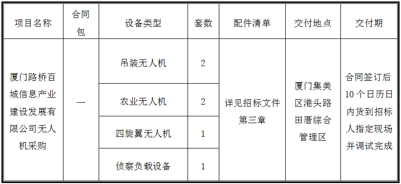 我司受廈門路橋百城信息產業(yè)建設發(fā)展有限公司委托,對廈門路橋百城信息產業(yè)建設發(fā)展有限公司無人機采購進行國內公開招標,現(xiàn)歡迎國內合格的投標人前來提交密封的投標。
